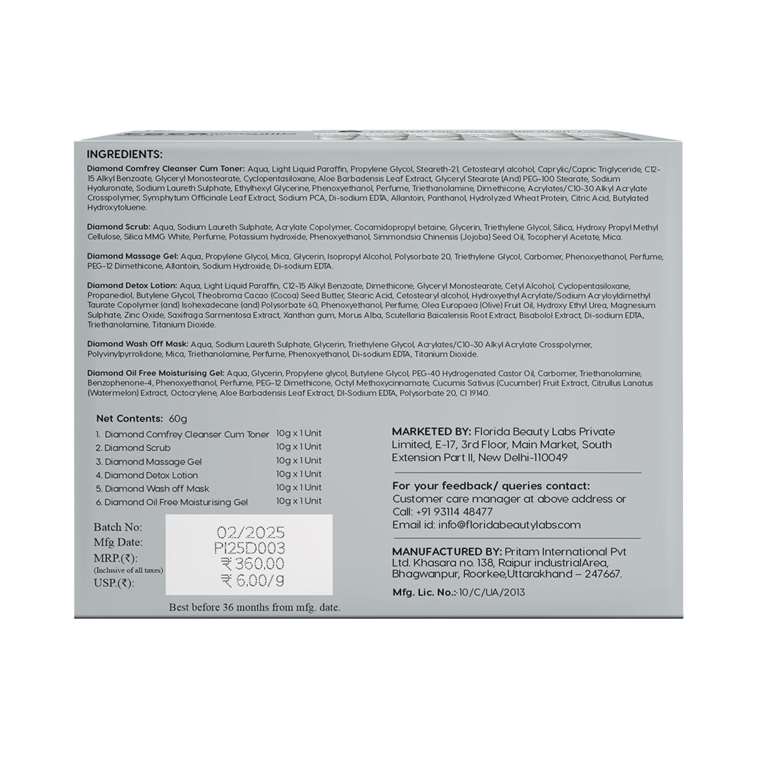 Diamond: This ingredient gently exfoliates the skin, removes dead skin cells, and enhances brightness for a radiant, flawless complexion. It helps improve skin texture and adds a natural glow.