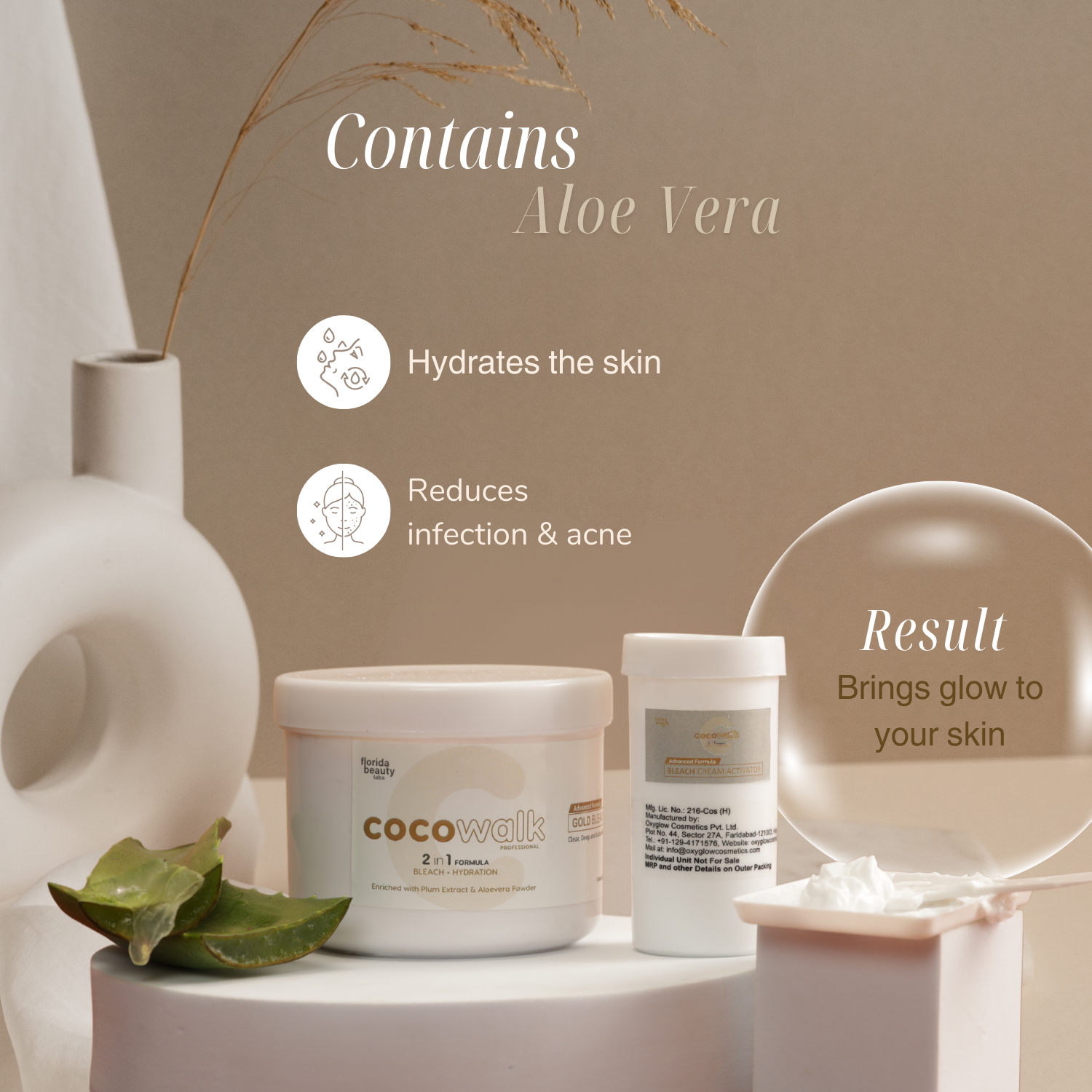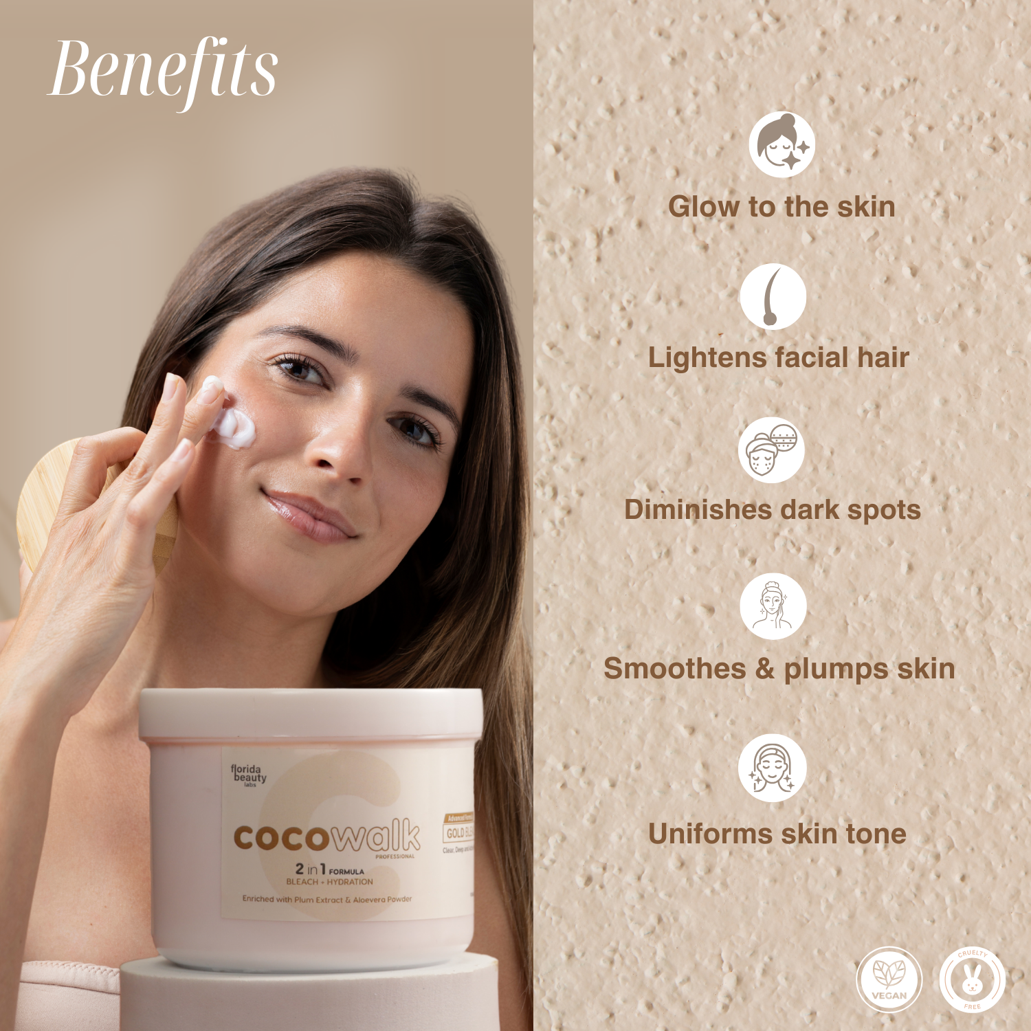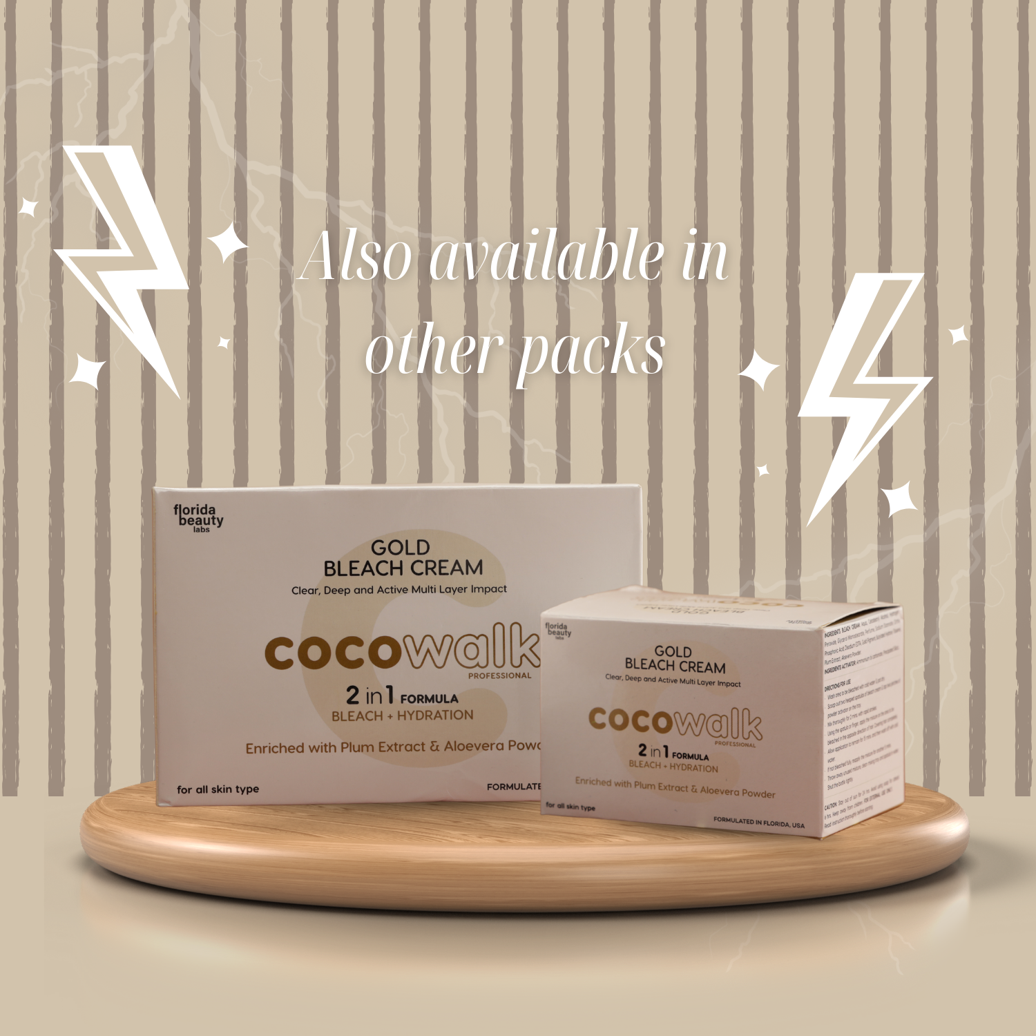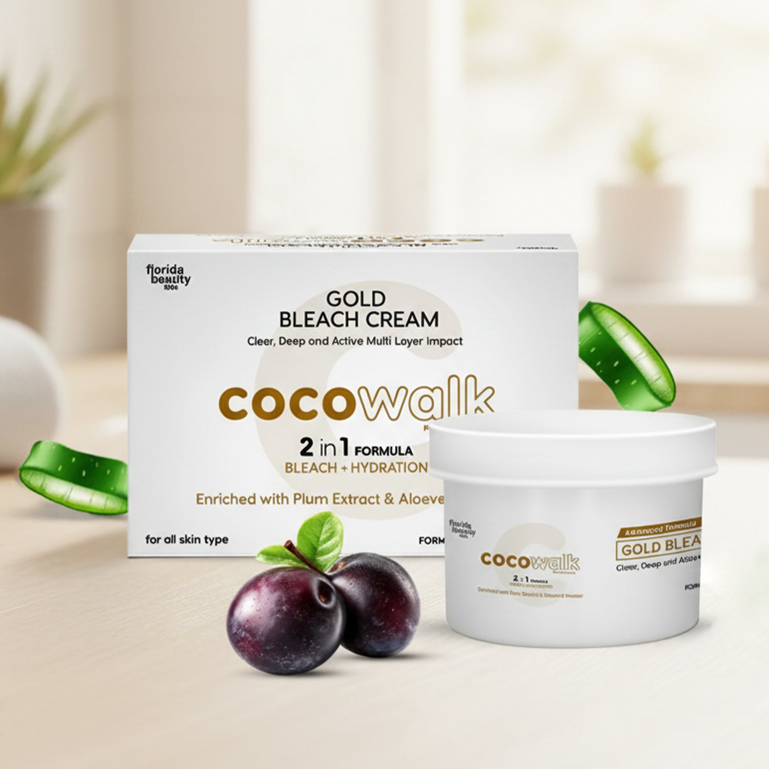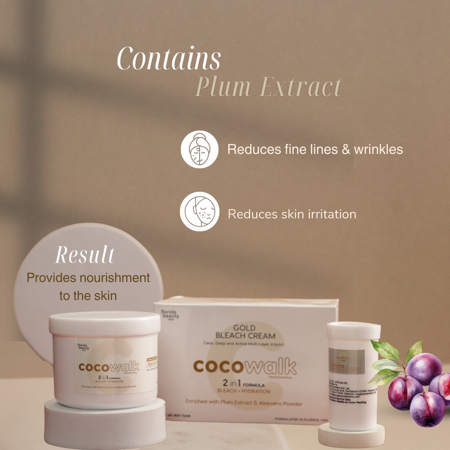 Gold Bleach Cream from Cocowalk Professional – a revolutionary 2-in-1 formulation combining the power of bleach and hydration in one exquisite package. With a potent blend of Plum extract and Aloe Vera powder, this bleach cream is a total game-changer. With this perfect blend of illuminating bleach and skin-quenching hydration, revealing your skin's timeless brilliance, gets easy-peasy in no time!