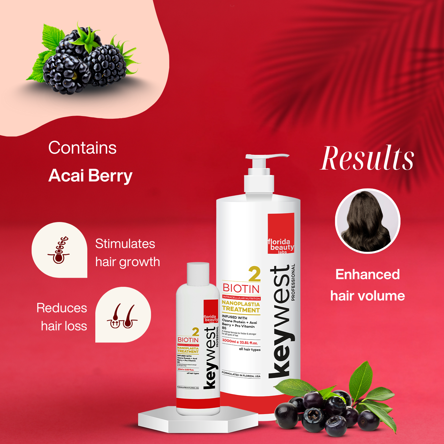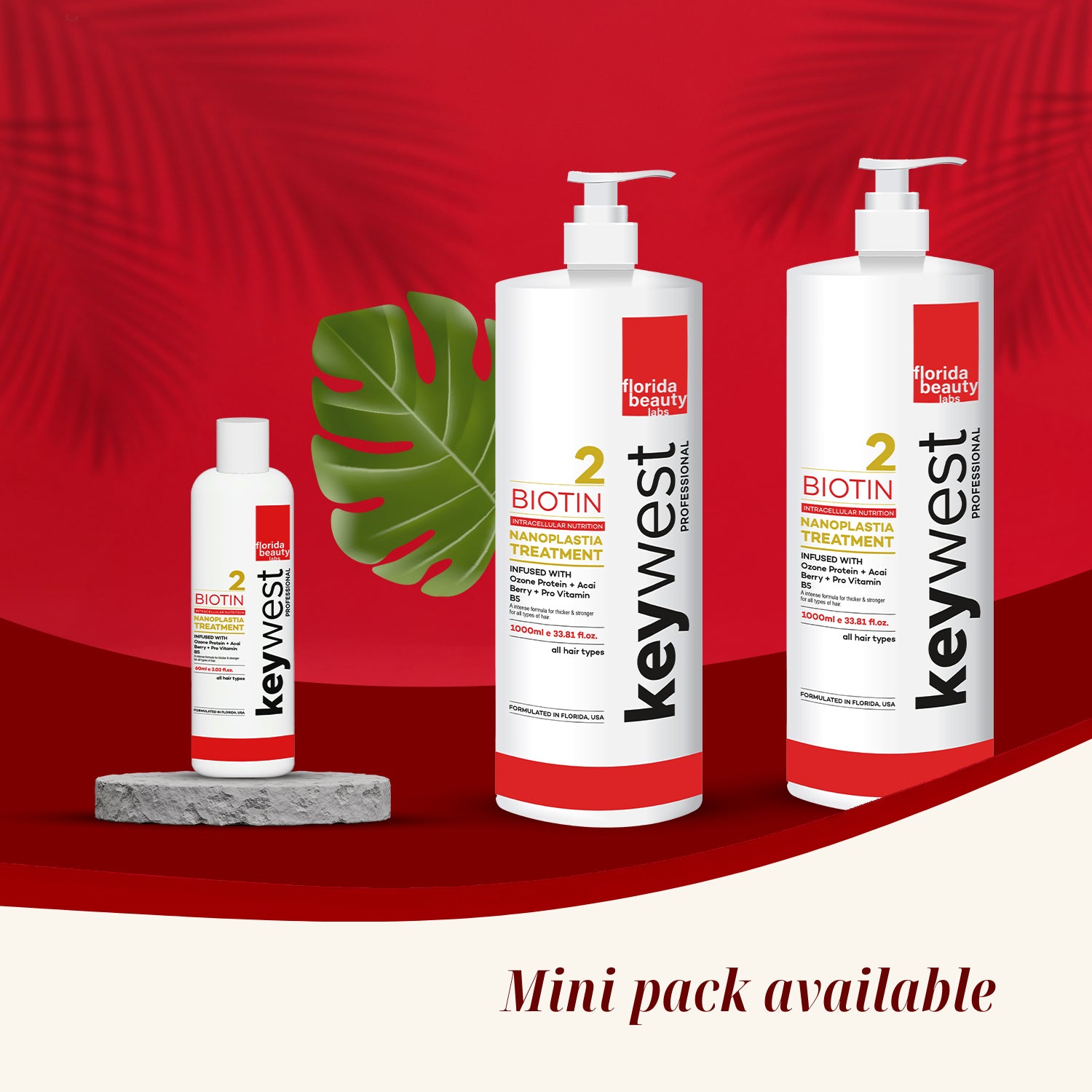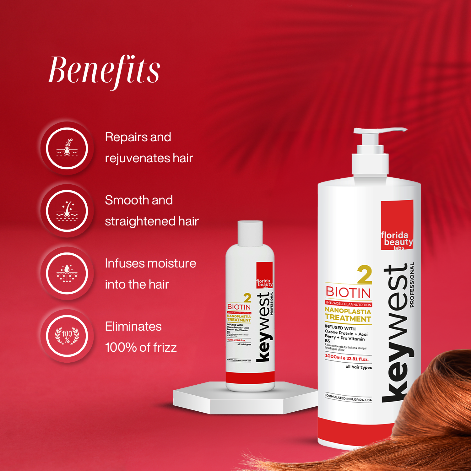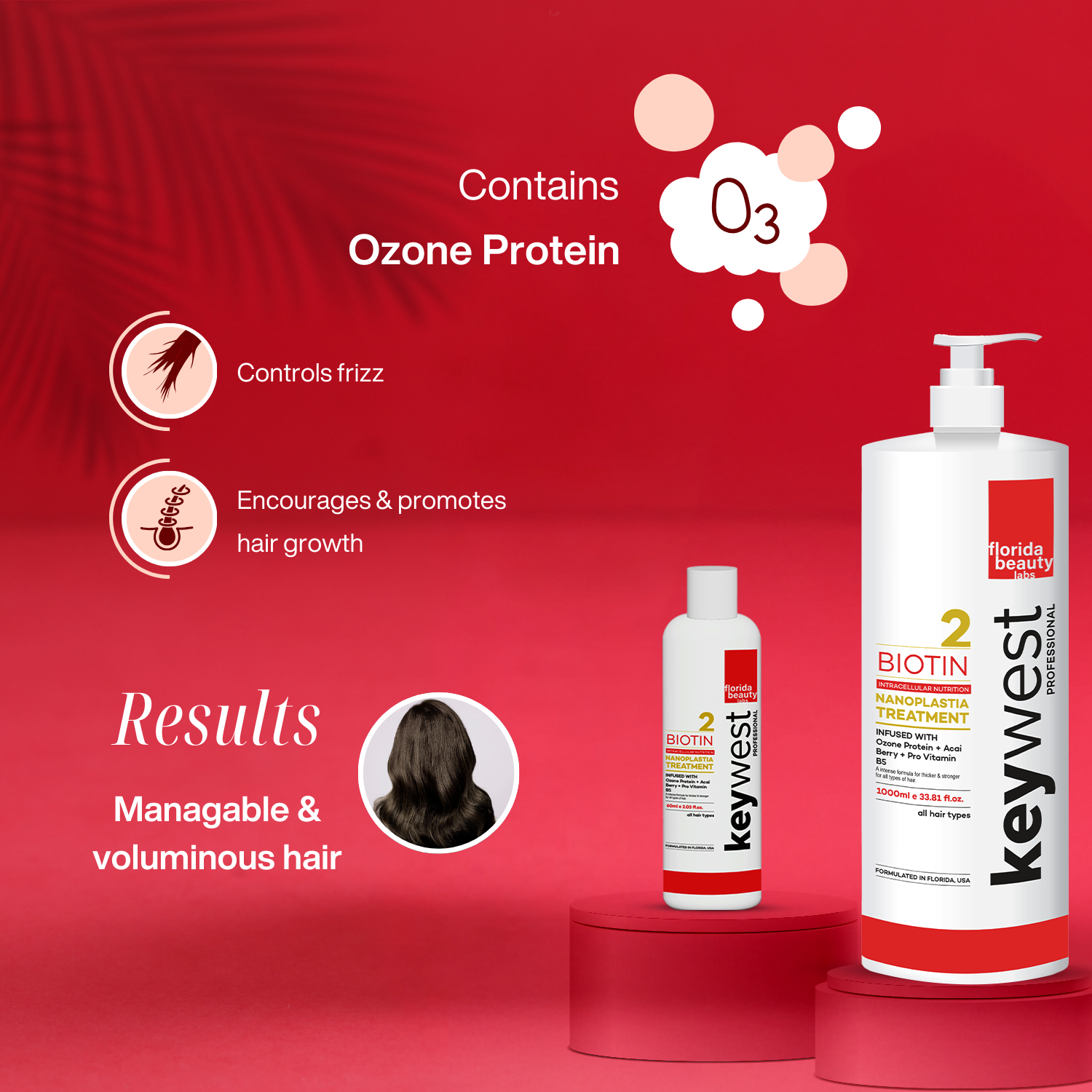 Keywest Professional's Nanoplastia Treatment! Enriched with Ozone Protein, Acai Berry, and Vitamin B5 will give strength, repair, smoothness, and shine to your hair.
