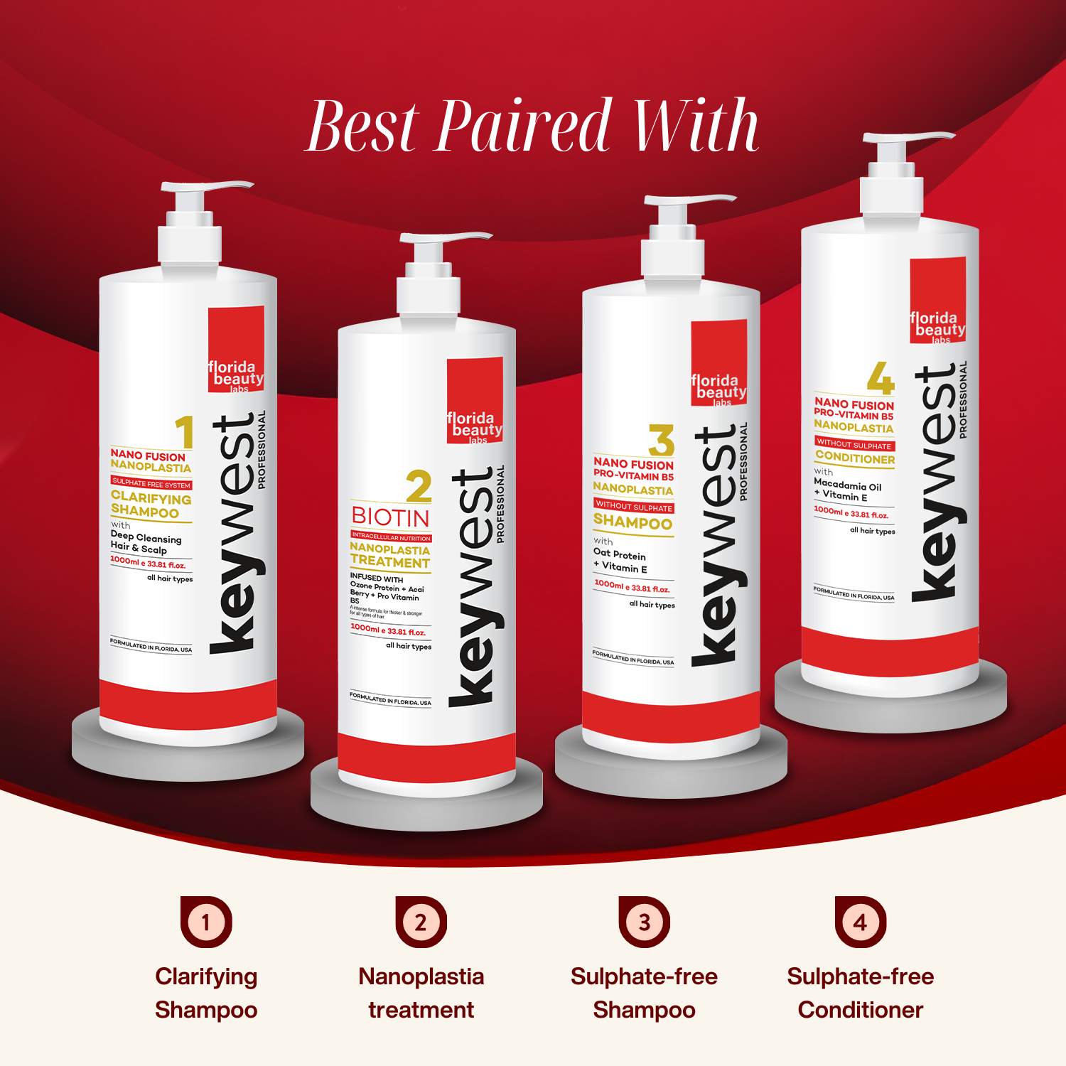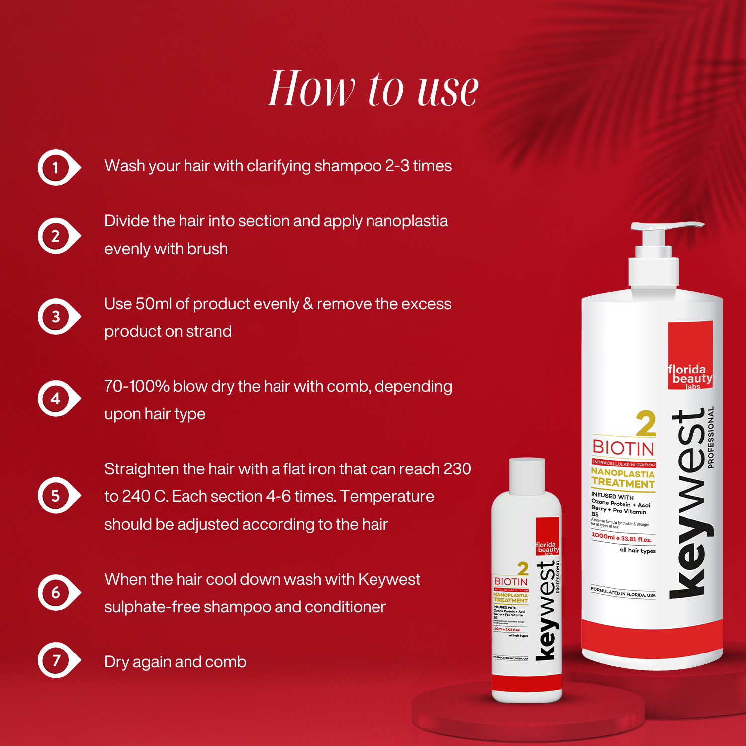 Before undergoing Nanoplastia treatment, ensure your hair is clean and free from any heavy products. Use Keywest Professionals clarifying shampoo to remove build-up in the scalp. Avoid using conditioners or oils before the treatment. Consult with a professional to discuss your hair's current condition and any specific needs to achieve the best results.
