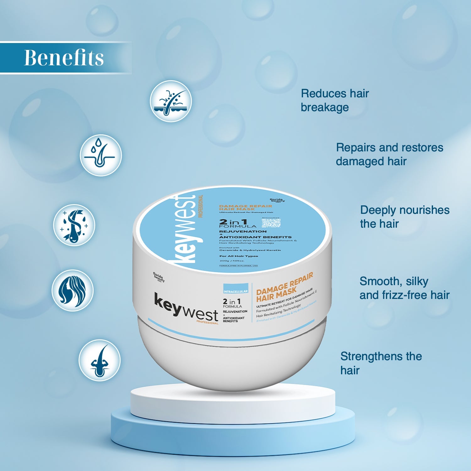 Keywest Professionals Damage Repair Hair Mask is a youth revitalizing hair mask that provides intense nourishment. The Damage Repair Hair Mask comes with a 2-in-1 formula that rejuvenates and gives antioxidant benefits to the hair.